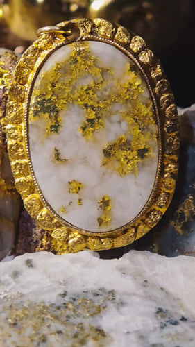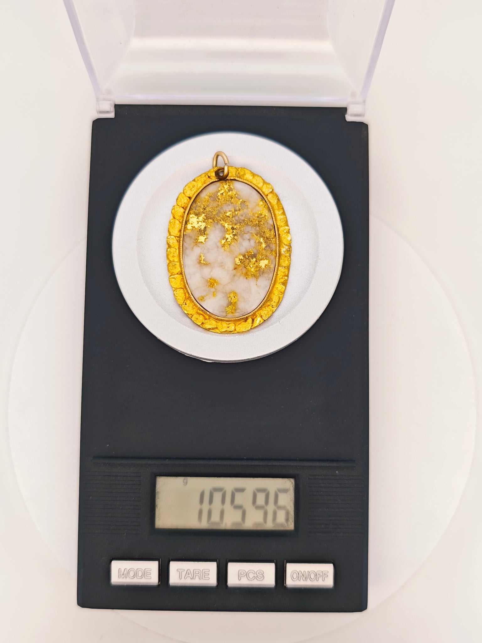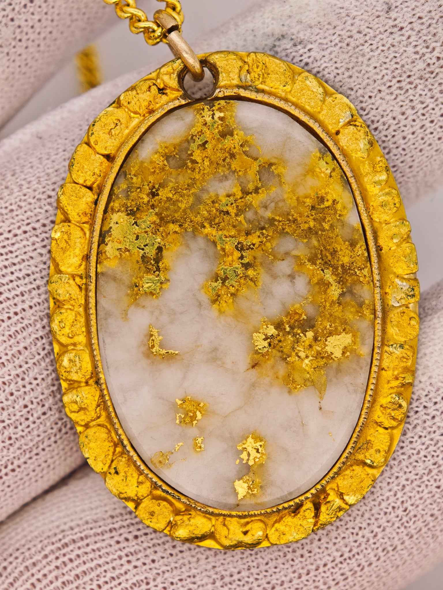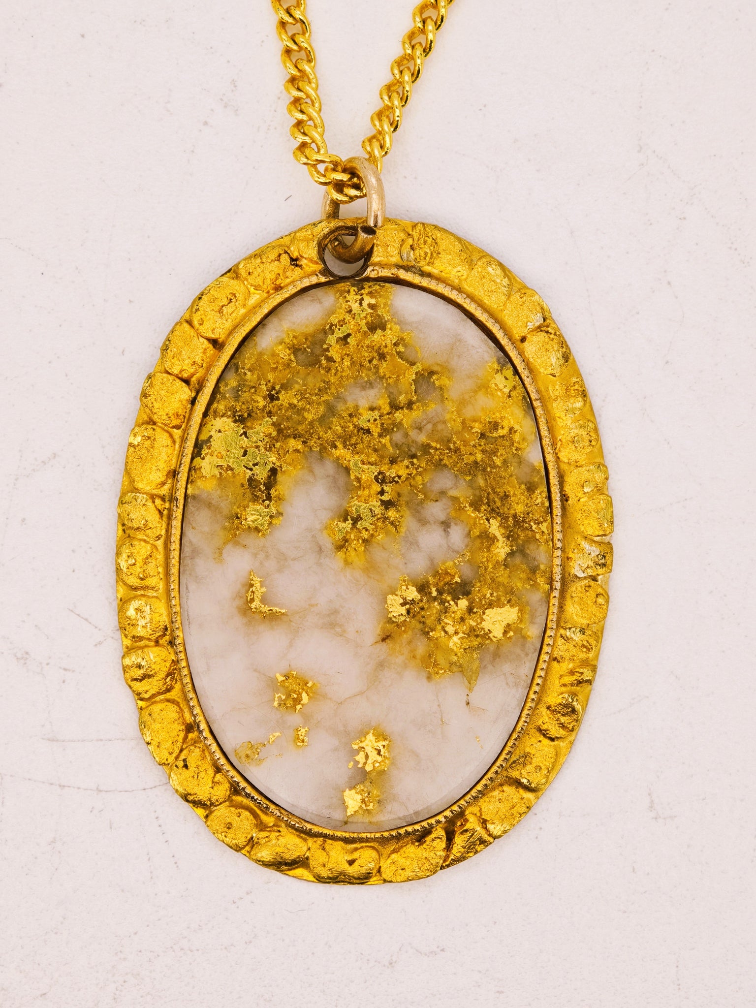 22k natural Gold Nuggets bordering all around the oval Gold Quartz pendant frame.