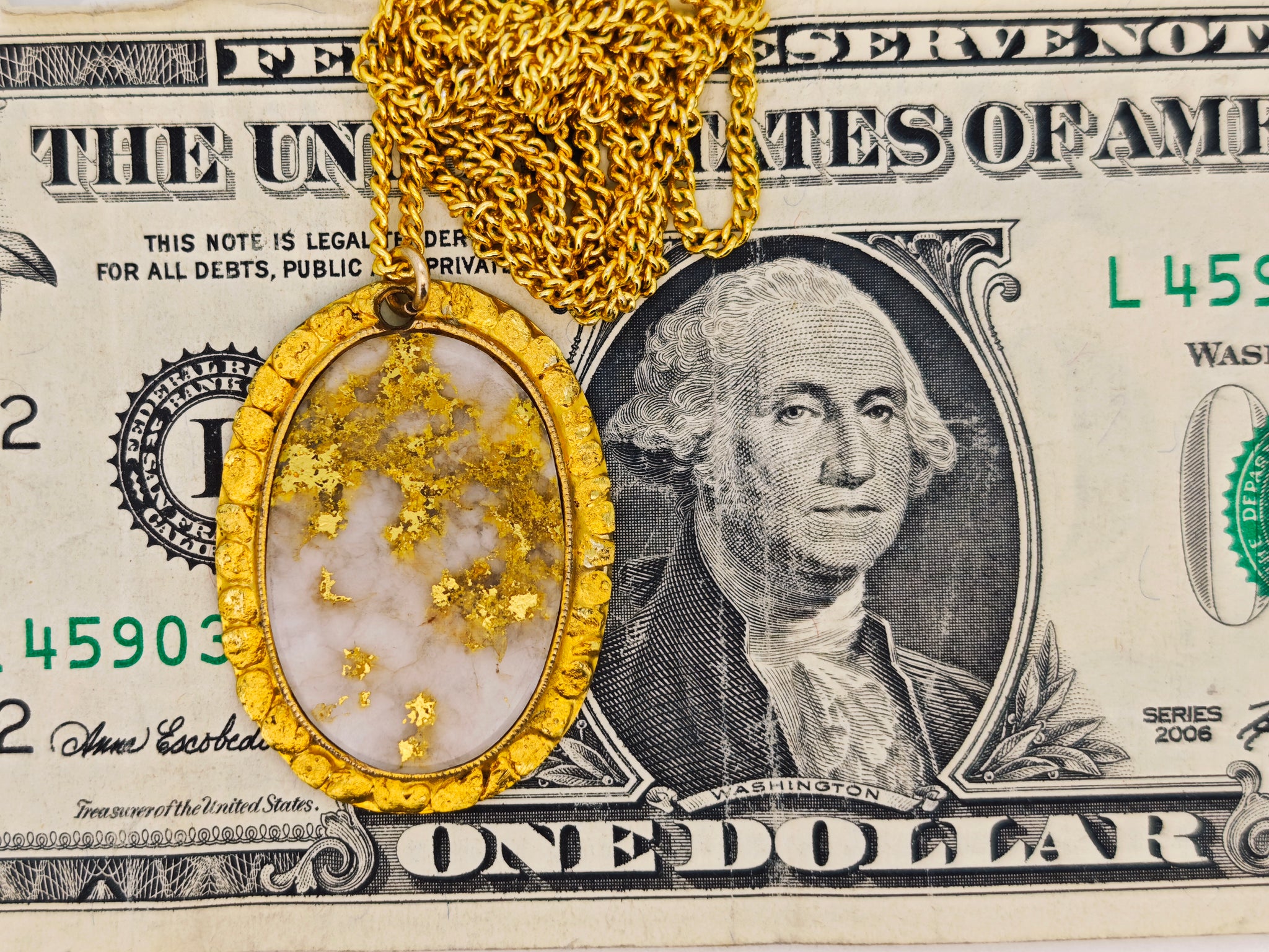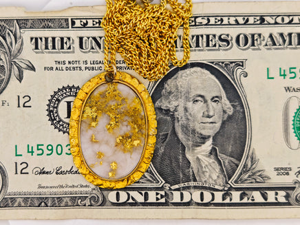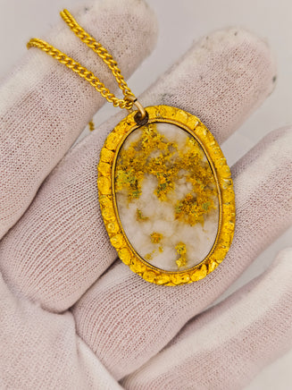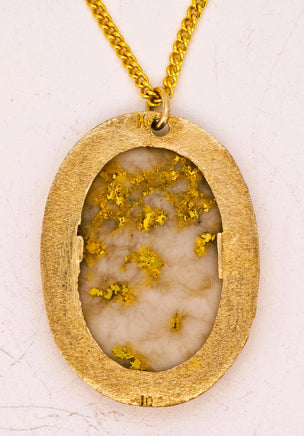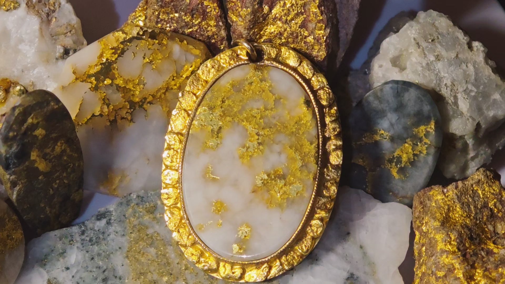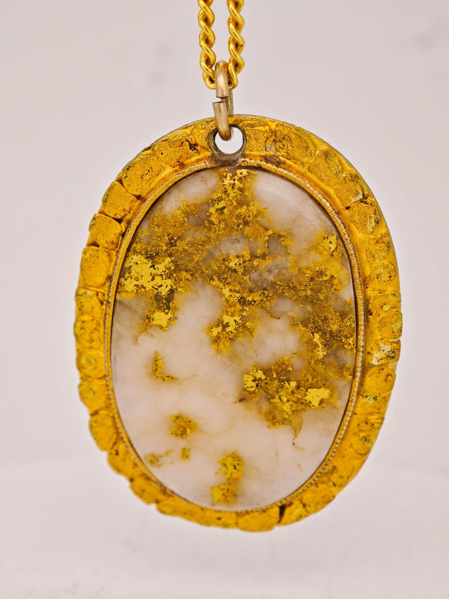 22k natural Gold Nuggets bordering all around the oval Gold Quartz pendant frame.