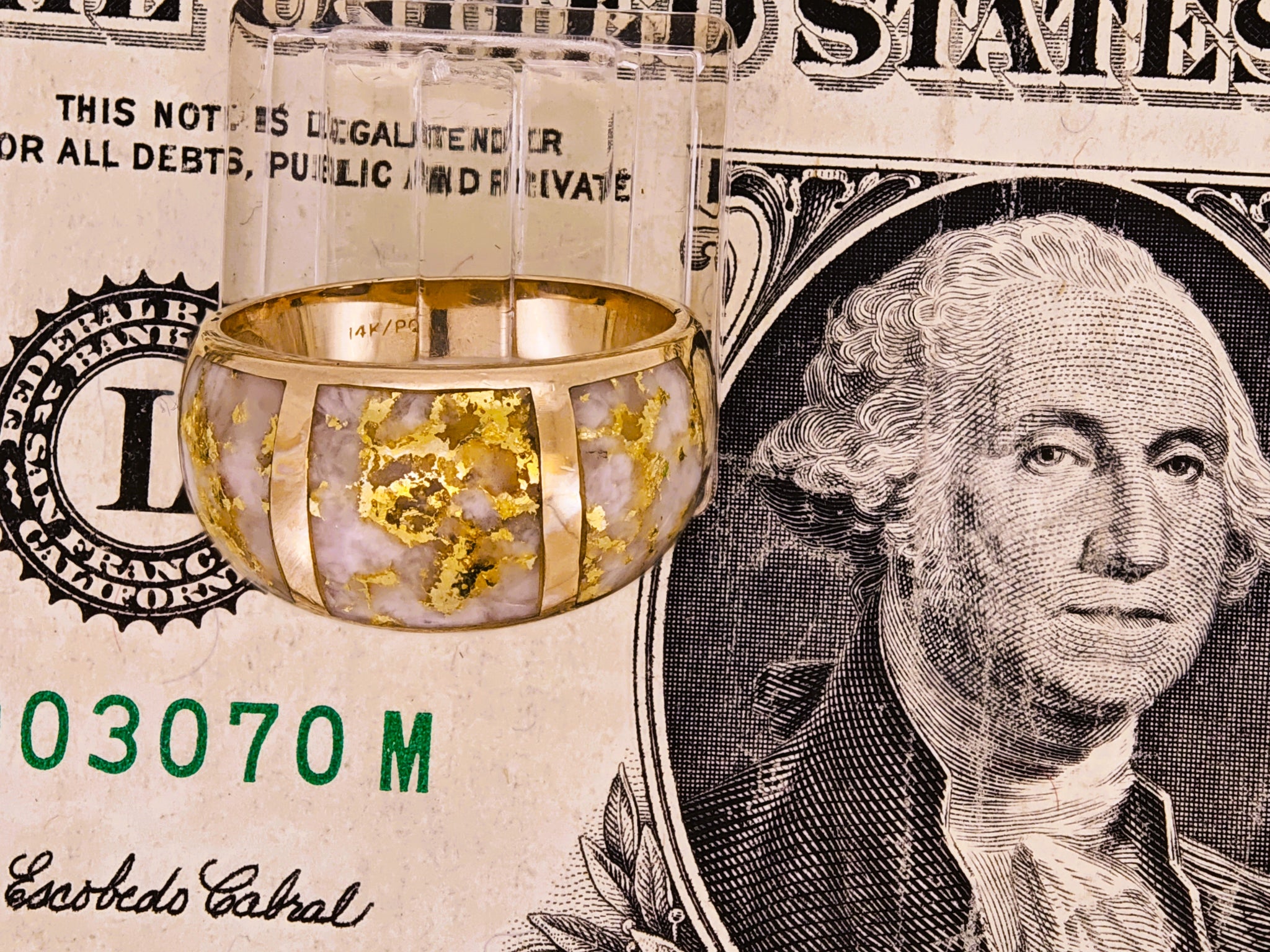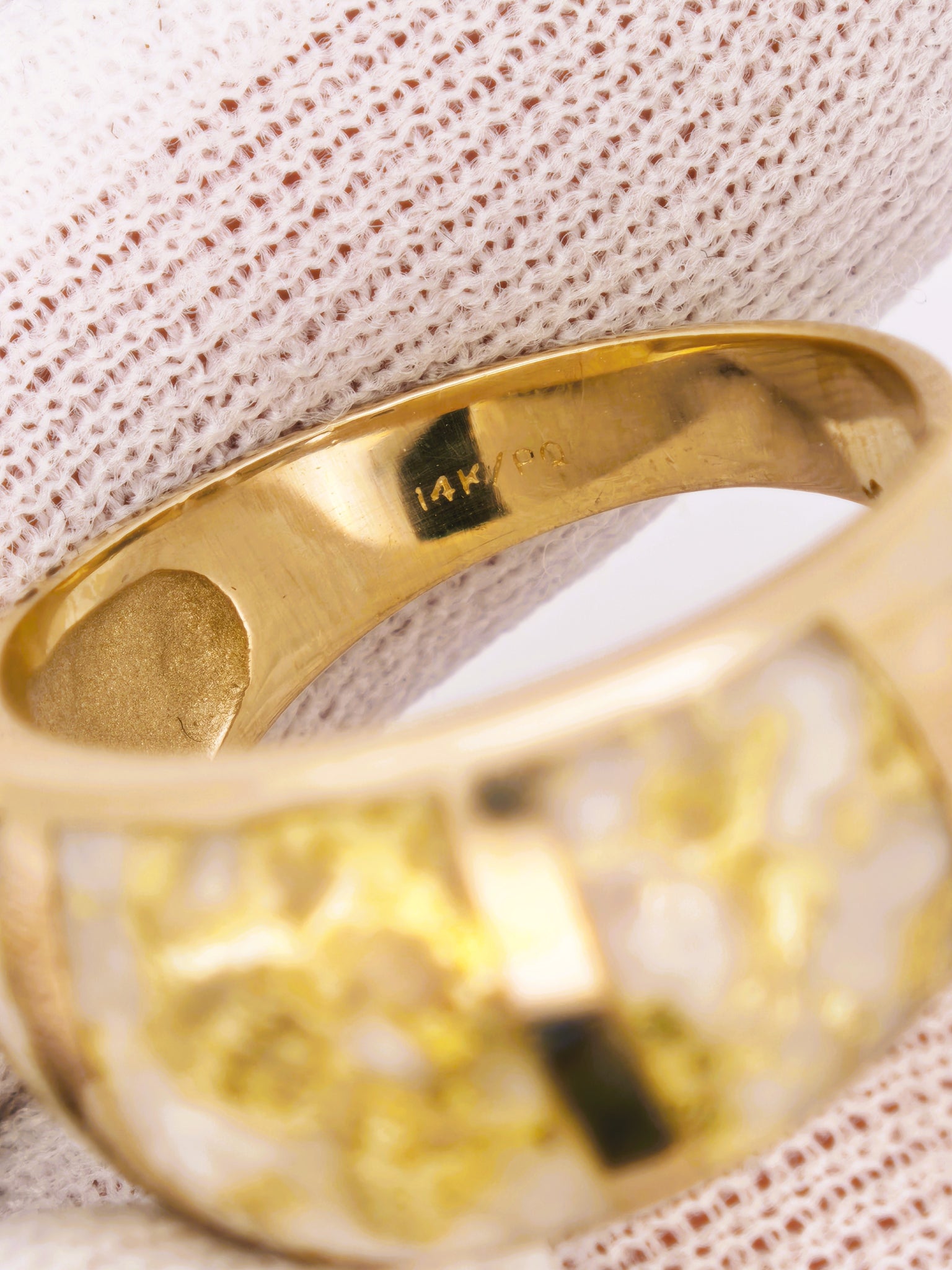 Metal & Hallmark: 14 karat solid yellow gold (ring) and 22-24kk pure gold veins in the specimen cab. Ring hallmarked 14k and authenticated.