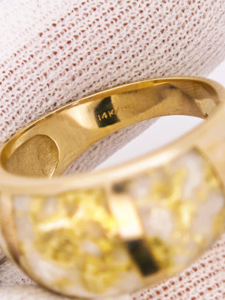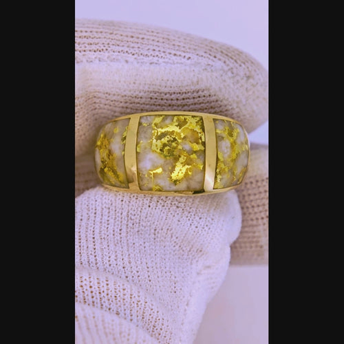 The gold in white quartz is set in a band of yellow gold, making it a versatile piece suitable for various occasions like engagements, weddings, anniversaries, and birthdays.