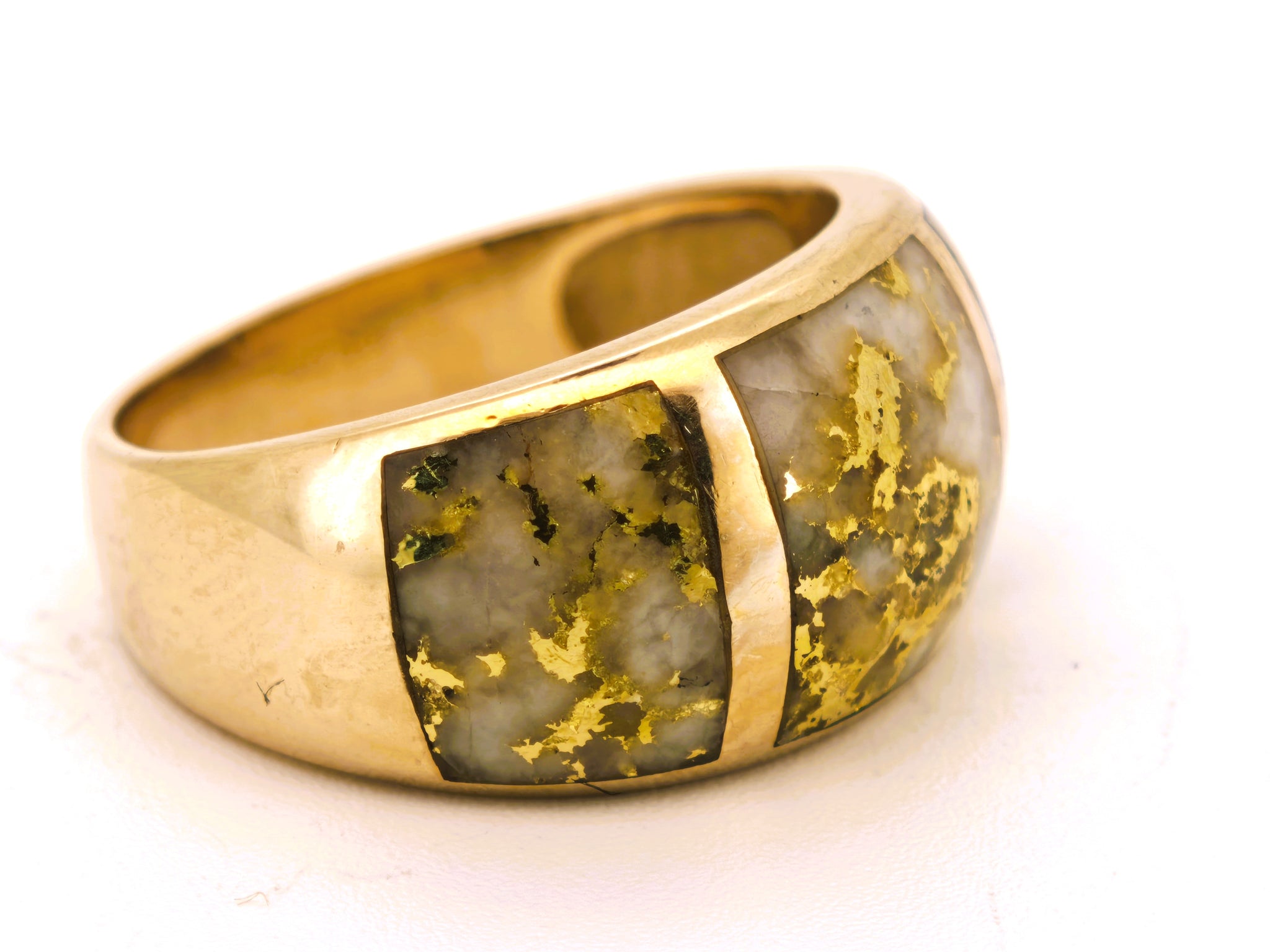 This gorgeous ring features 3 panels of A++ grade gold quartz inlays that are pristine.