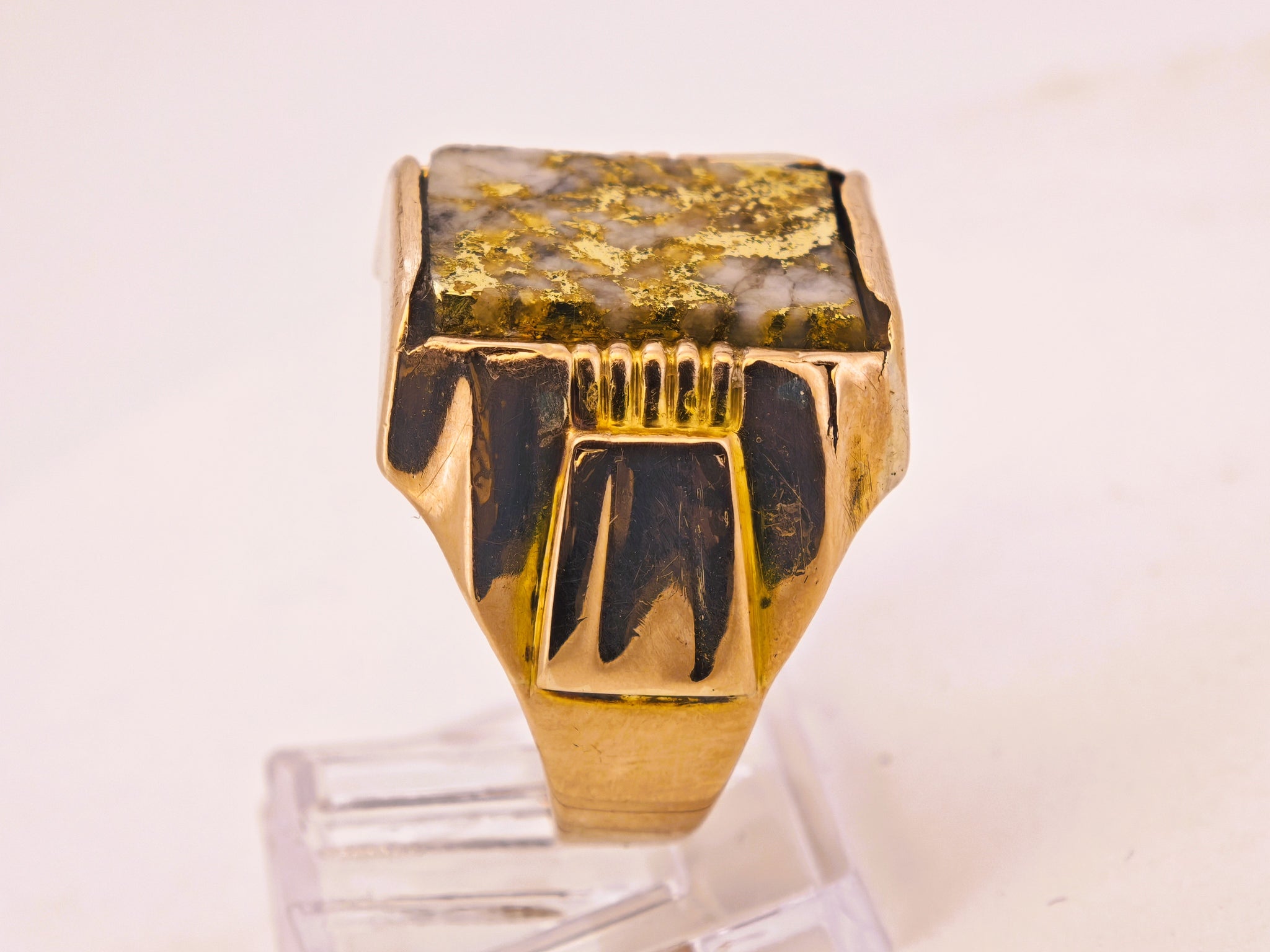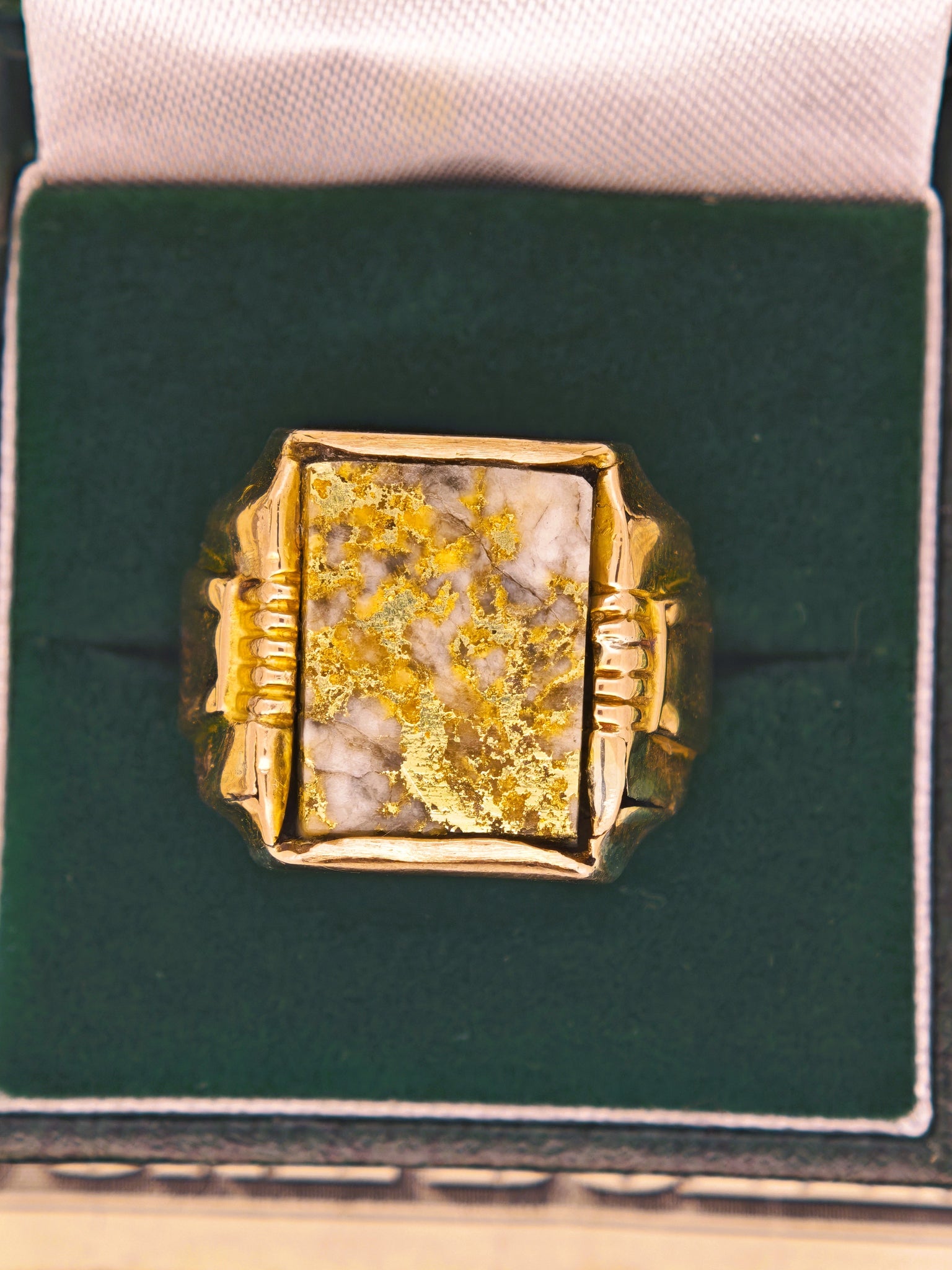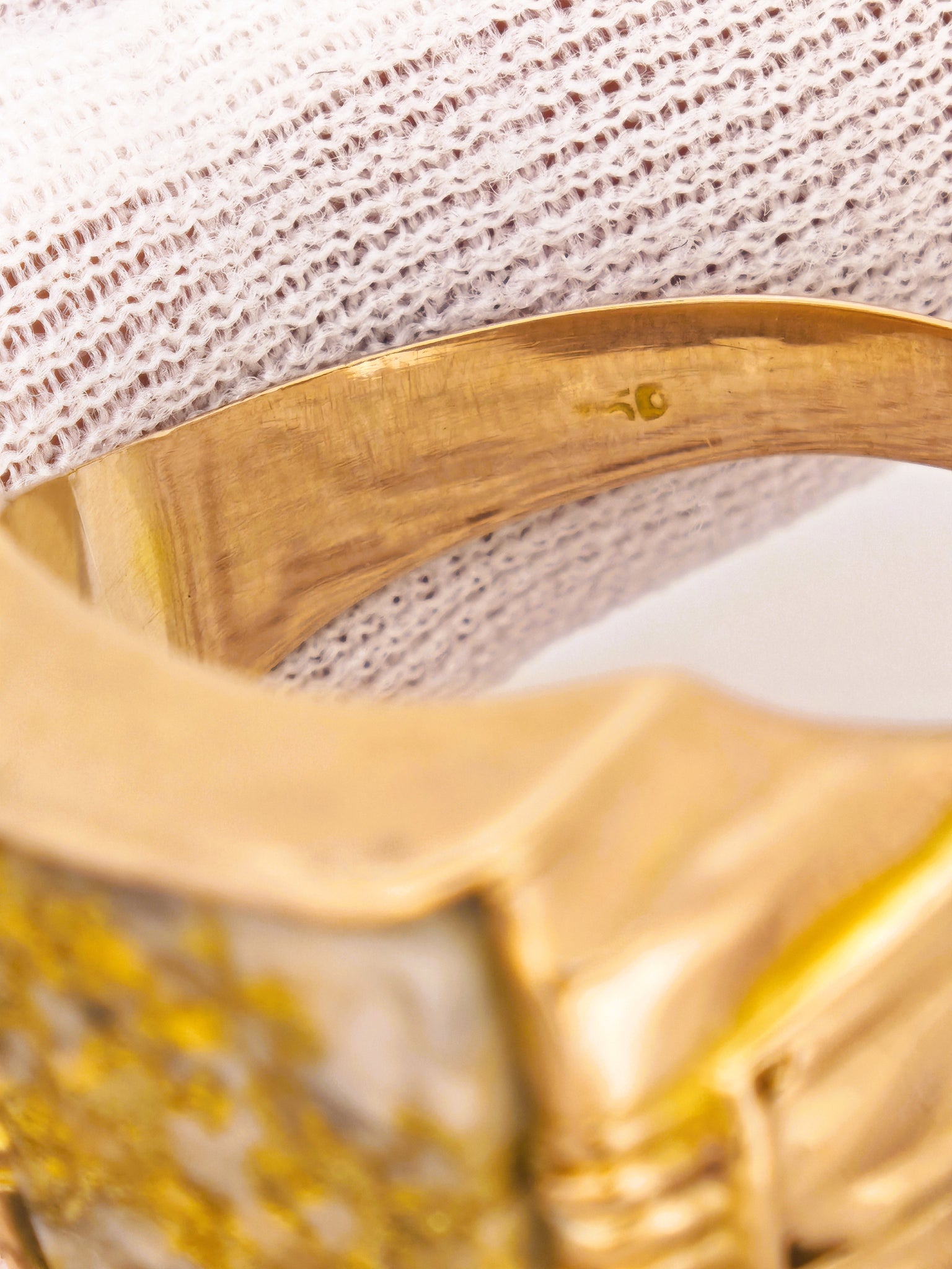 Metal & Hallmark: 18 karat solid yellow gold (ring) and 22-24kk pure gold veins in the specimen cab. Ring hallmarked 750 for 18k.