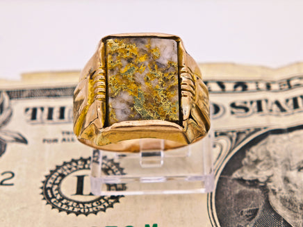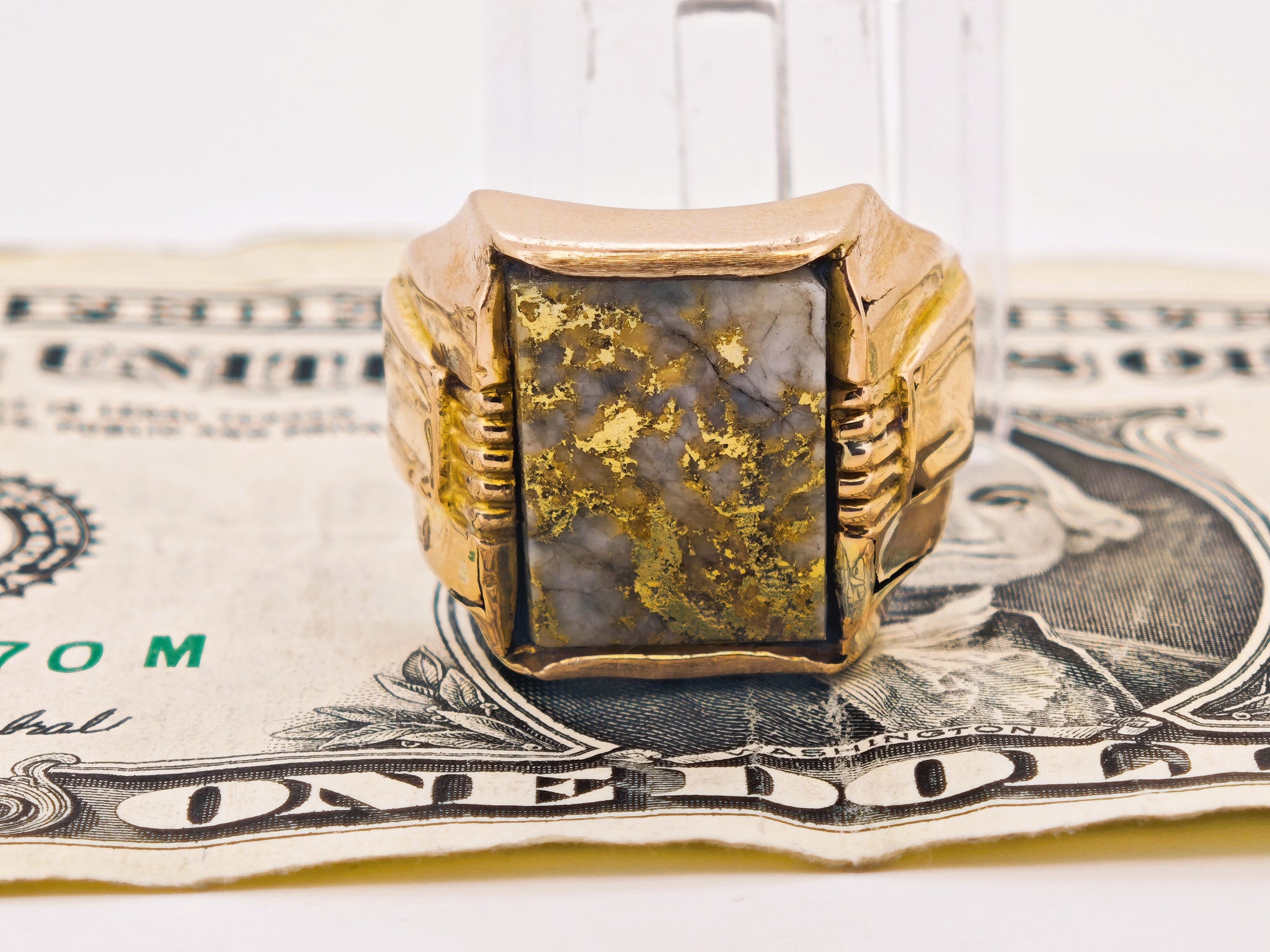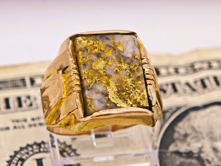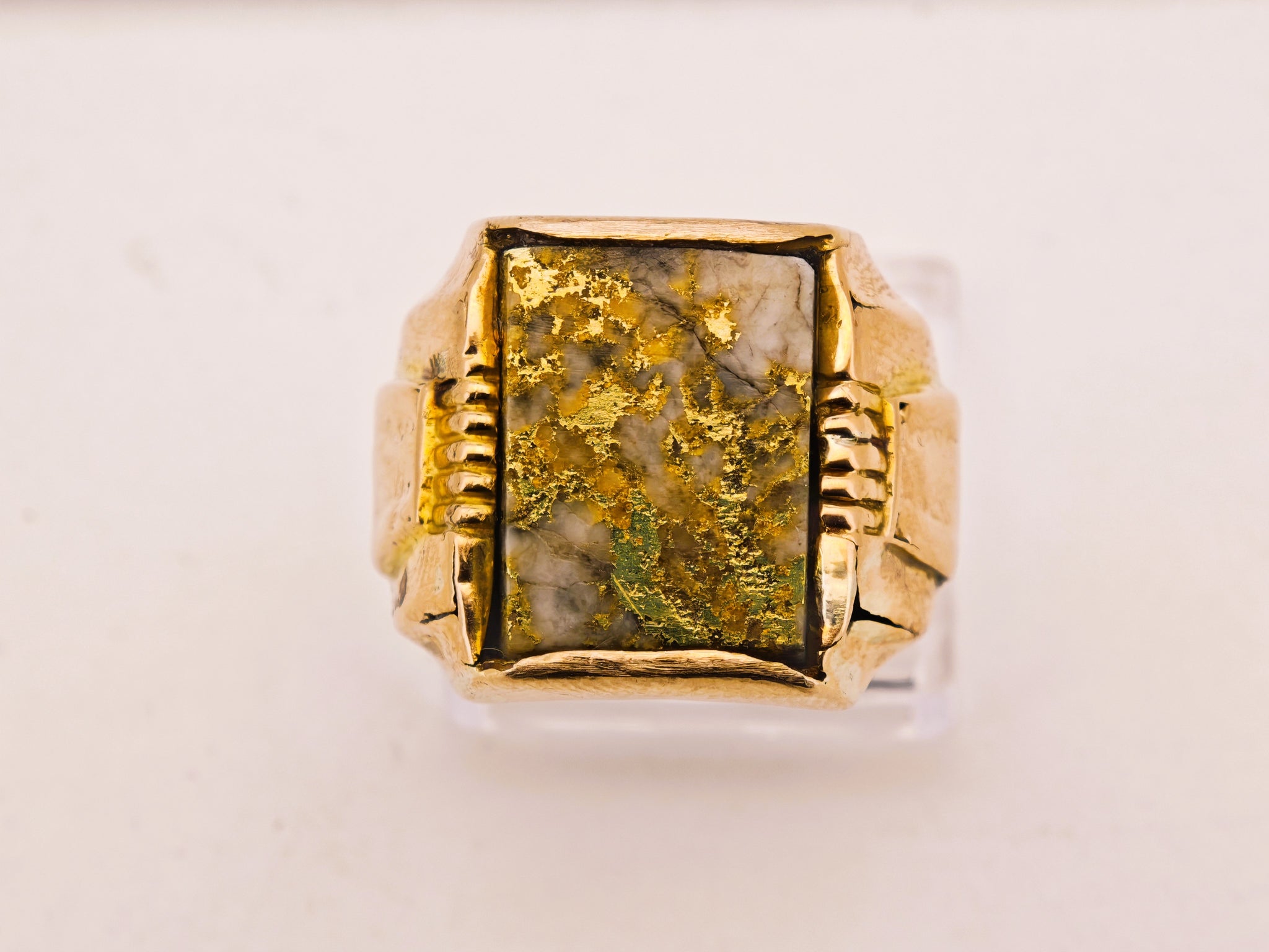 Metal & Hallmark: 18 karat solid yellow gold (ring) and 22-24kk pure gold veins in the specimen cab. Ring hallmarked 750 for 18k.