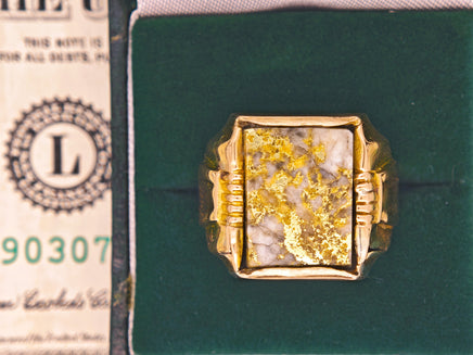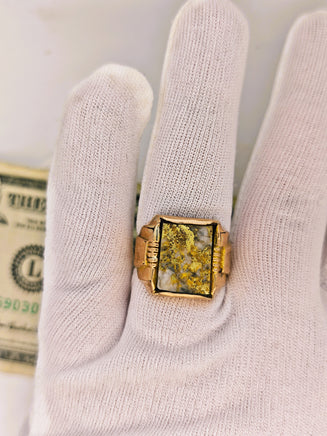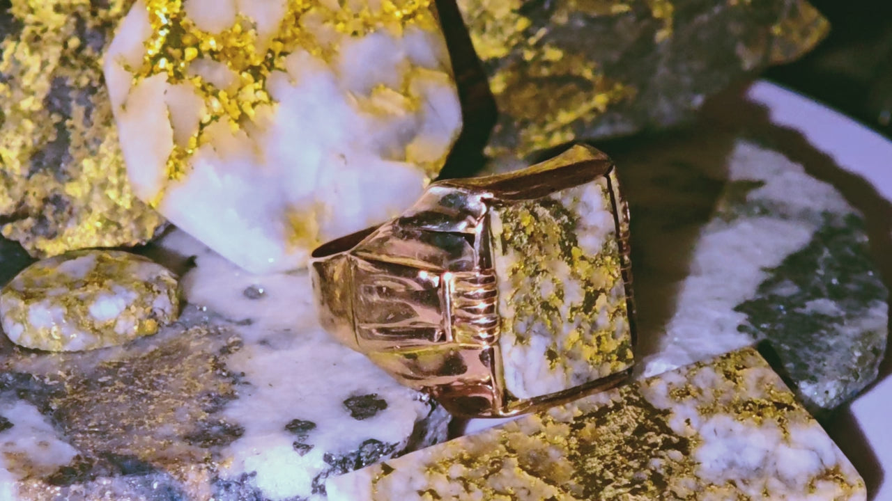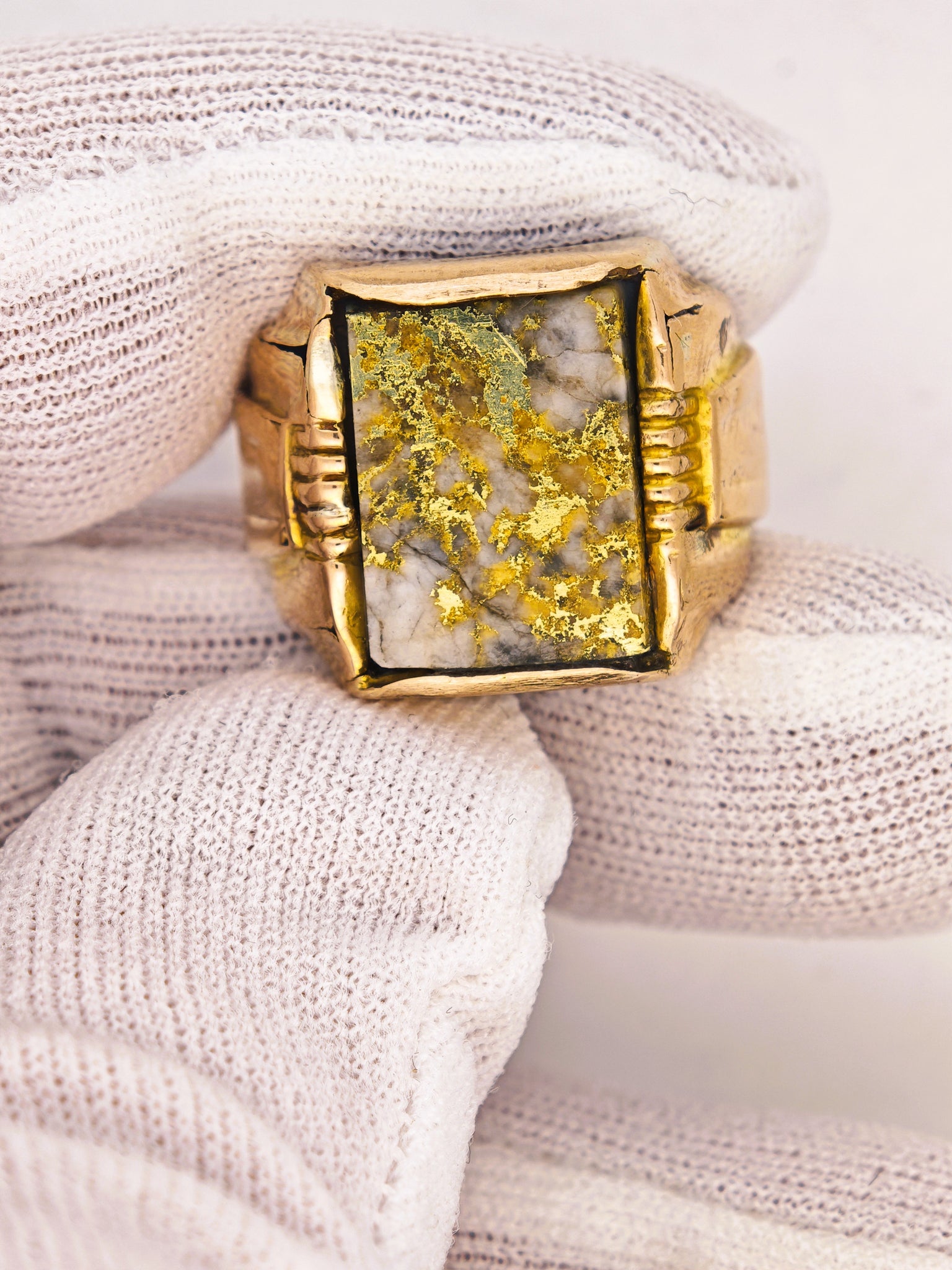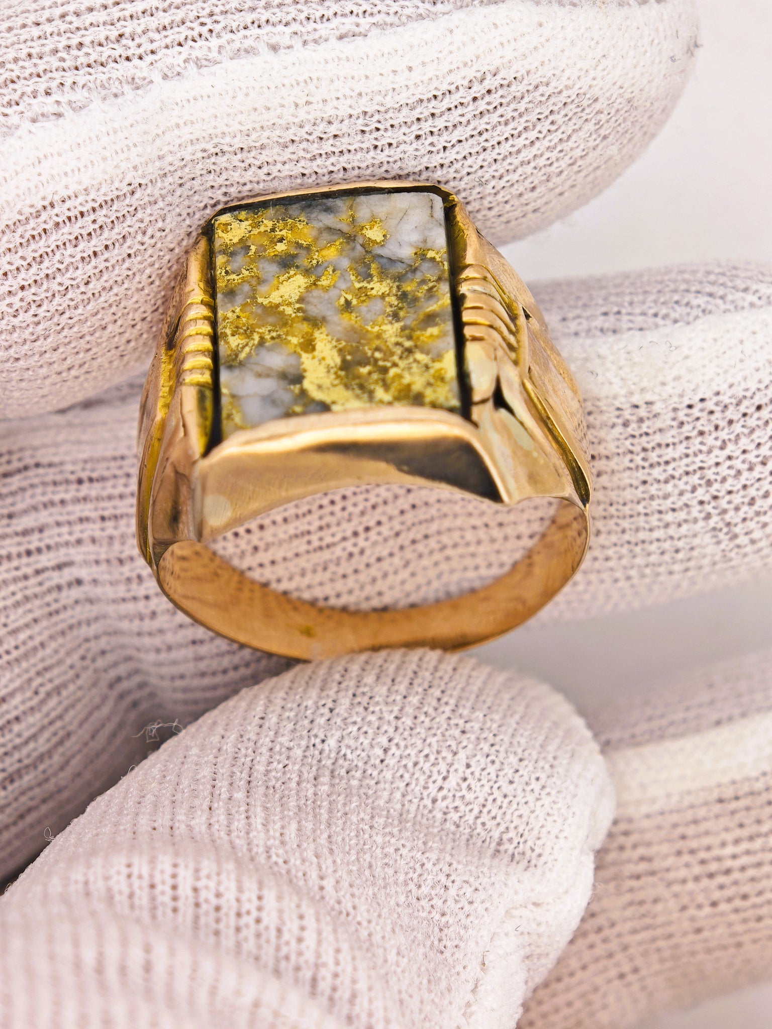 The stone is beautifully set in a solid 18K yellow gold band, hallmarked 750, giving the ring both luxury and enduring quality. Mined from the world-famous 16to1 deposit, the quartz features rich 22K gold running cleanly through the pristine white matrix, with remarkable clarity and no visible flaws.